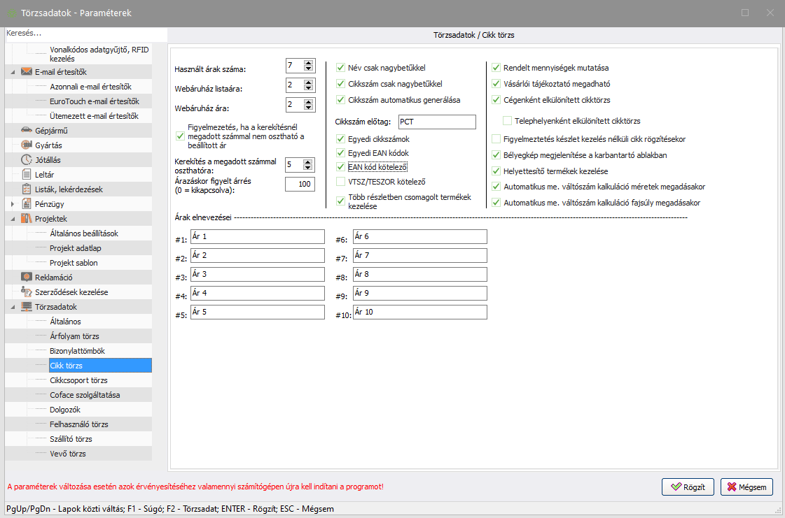 Elérése: Törzsadatok -> Paraméterek -> Törzsadatok (fül) -> Cikktörzs (fül) vagy