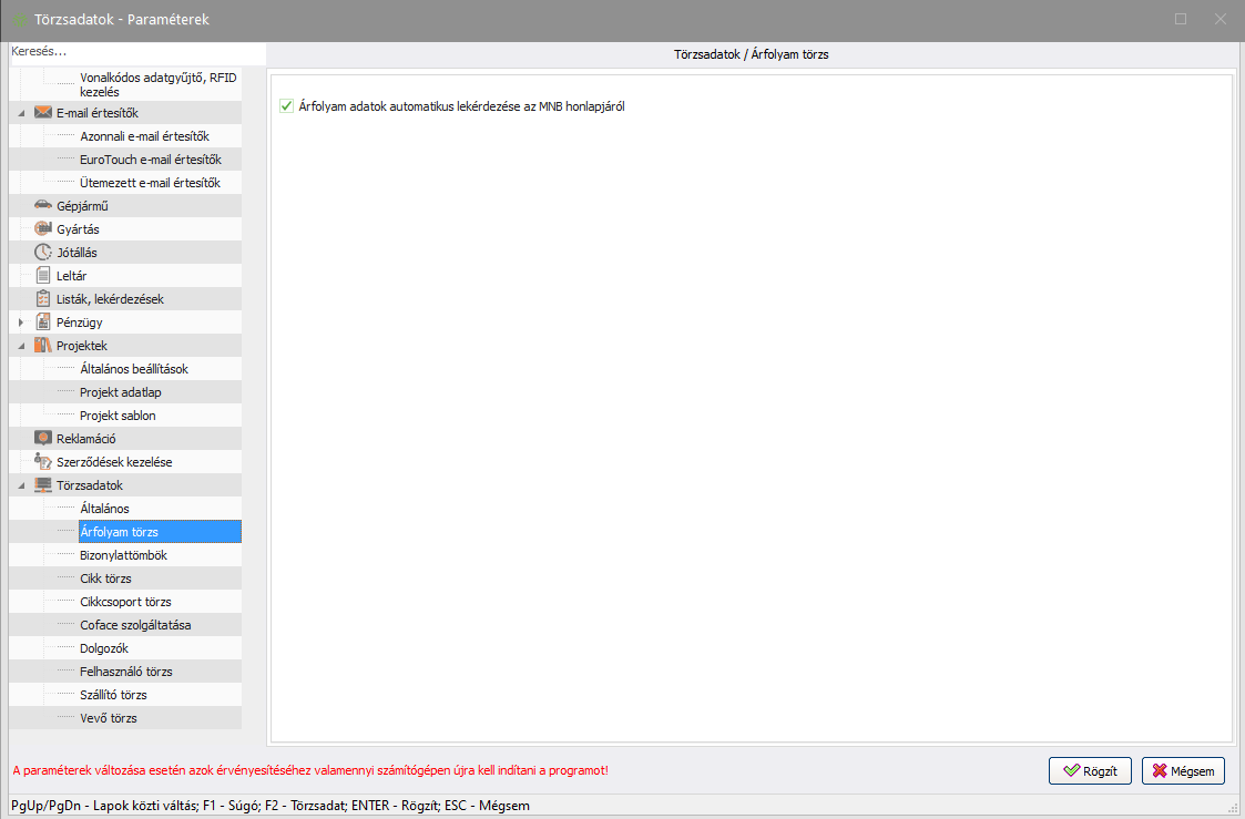 Elérése: Törzsadatok -> Paraméterek -> Törzsadatok (fül) -> Árfolyam törzs (fül) vagy