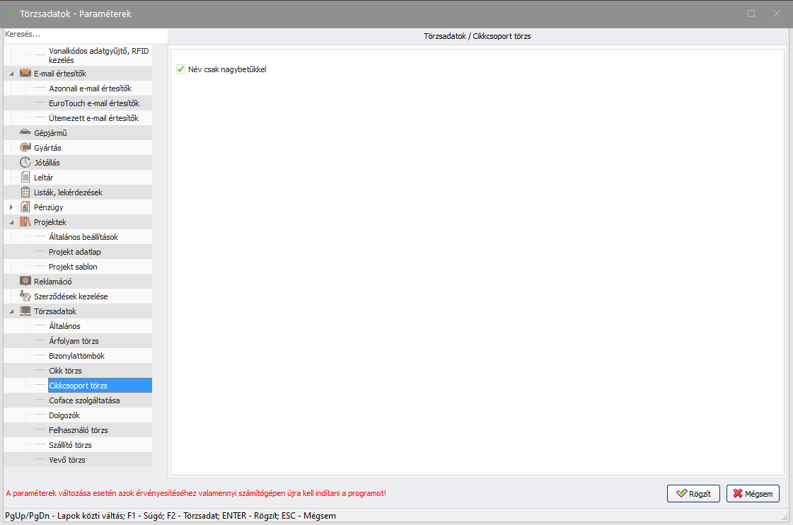 Beállítás esetén: A cikkcsoport neve csak nagybetűket tartalmazhat (nem engedi a kisbetűket, automatikusan konvertálja őket nagybetűkre).