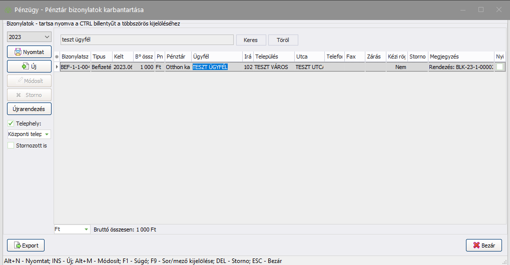 Fontos! Kizárólag olyan bizonylat sztornózható, amely nem más bizonylathoz kapcsolódik, és nem lezárt állapotú! Amennyiben a bizonylat egy Pénztár zárás funkcióval lezárt ciklusból származik, úgy nem sztornózható. Továbbá ha van a bizonylathoz kapcsolódó banki forgalmi adat (Pénztári feladás, Banki kivét), akkor az automatikusan törlődik.