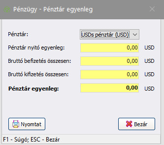 Elérése: Pénzügy -> Pénztár kezelés -> Pénztár egyenleg