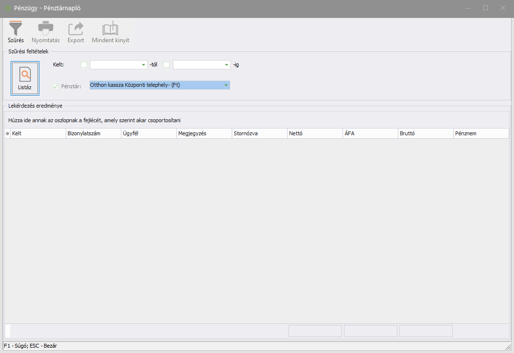 Az Pénztárnapló ablak alapértelmezetten üres állapotban nyílik meg. Miután beállította a szűrési feltételeket, a