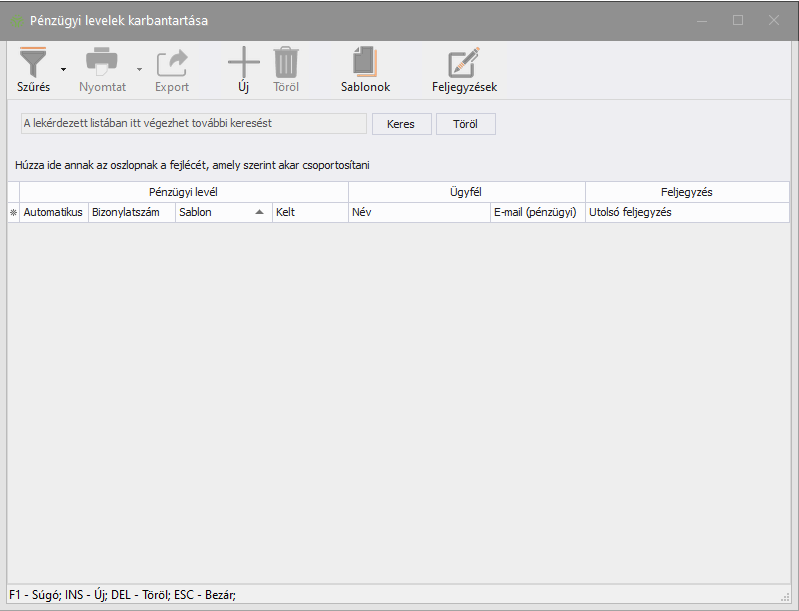 A funkció főképernyőjén a lista a már elkészült pénzügyi leveleket jeleníti meg függetlenül attól, hogy manuális vagy automatikus úton készültek (a lista első oszlopában ez az információ megjelenik). A lista kereshető, rendezhető, csoportosítható. Felhasználóként az alábbi lehetőség közül választhat: