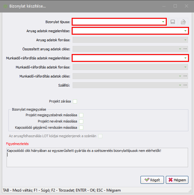 A funkció segítségével a projekthez bizonylatokat generálhat. Csak adatlap üzemmódban vagy a projekt listából érhető el!