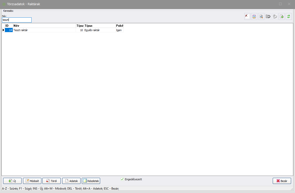 Fontos! Kizárólag olyan raktár törölhető, amelynek még nem volt forgalma! Amennyiben nincs szüksége egy olyan raktárra, amelyik nem törölhető forgalma miatt, érdemes engedélyezett státuszát kikapcsolni. Ez esetben a rendszerben továbbra is szerepel, adatai, bizonylatai elérhetőek, felhasználhatók, ám a raktár nem használható tárolásra mindaddig, amíg újra engedélyezett státuszát vissza nem állítja.