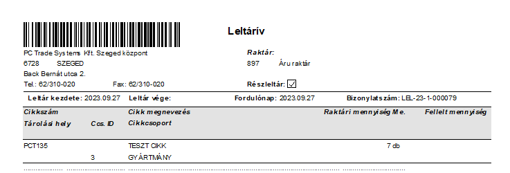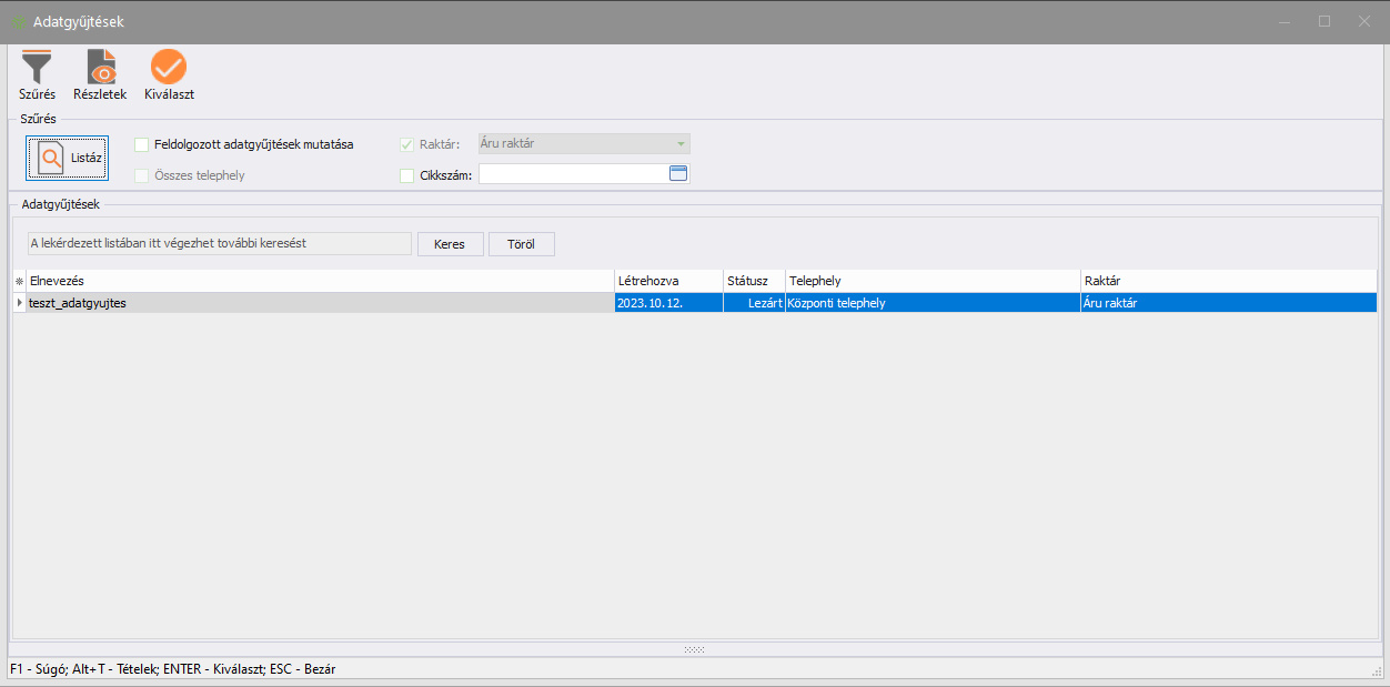 - minimum 1 db cikk kiválasztása szükséges a részleltár indításához,