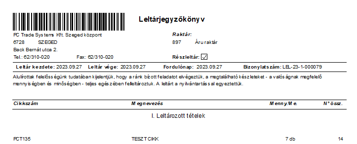 A leltáríven, Leltárjegyzőkönyvön jelölésre kerül, hogy adott leltár teljes, vagy részleltár-e:
