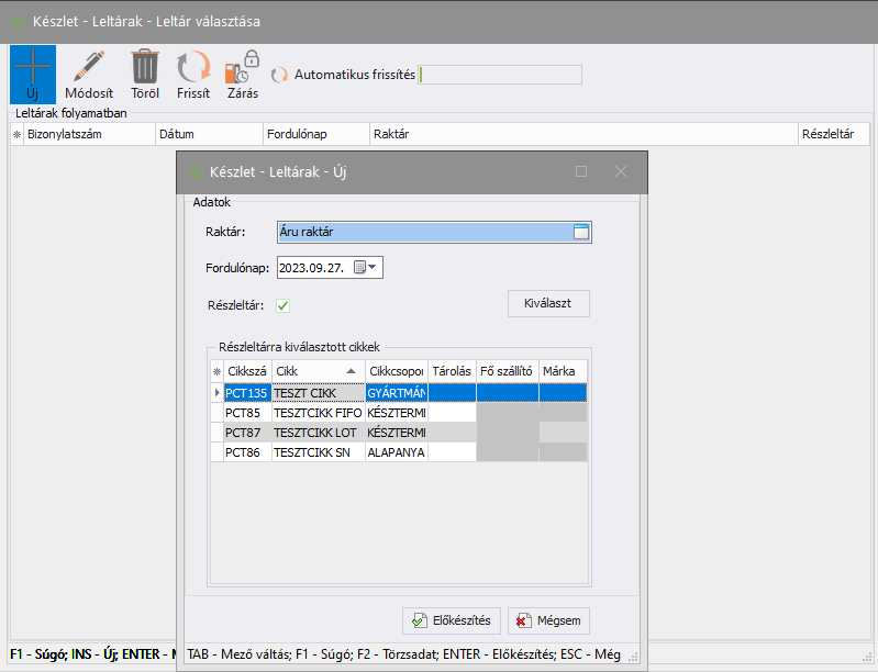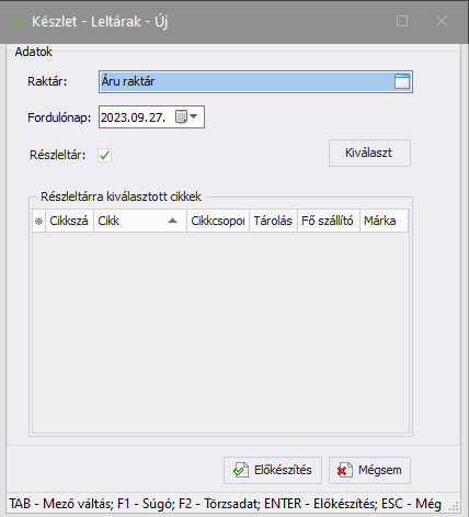 (Előkészítés) gombra kattintva van lehetőség a részleltárra kijelölt cikkekkel elindítani a részleltárt.