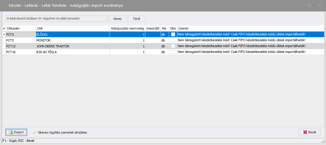 Az adatgyűjtés import eredménye ablakban tekintheti meg az adatgyűjtésre eredményére vonatkozó listát. Az adatgyűjtés importból kimaradó cikkek esetében a rendszer üzenetet jelenít meg arról, hogy a cikk importja miért nem lehetséges a rendszerbe. A sikeres adatgyűjtésre vonatkozó cikkek megjelenítése a
