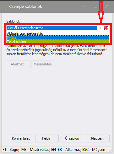Sablon törléséhez a Csempe sablonok ablakban válassza ki a lenyíló sablonlistából a törölni kívánt sablont, majd a mező melletti