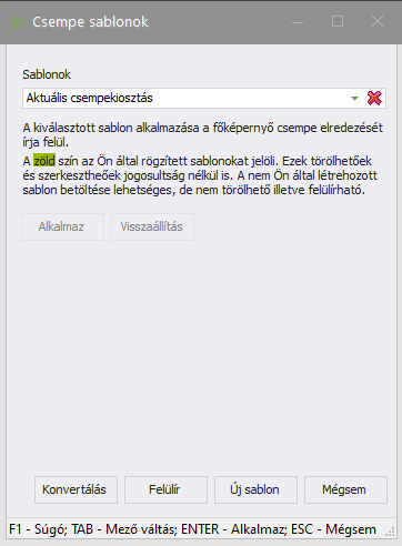 A sablonok listában zöld háttérszínnel vannak jelölve azok a sablonok, amelyeket az aktuálisan bejelentkezett felhasználó hozott létre. A fehér háttérszínű sablont egy másik felhasználó hozta létre.