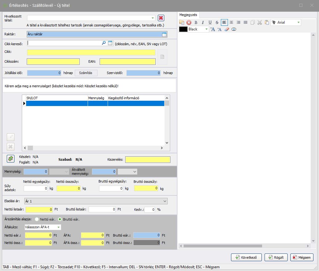 mezőbe a kívánt mennyiséget. - A Nettó e. súly melletti mezőbe a cikk súlya megjelenik (a cikk törzsből veszi az adatot). Ez szabadon módosítható.
