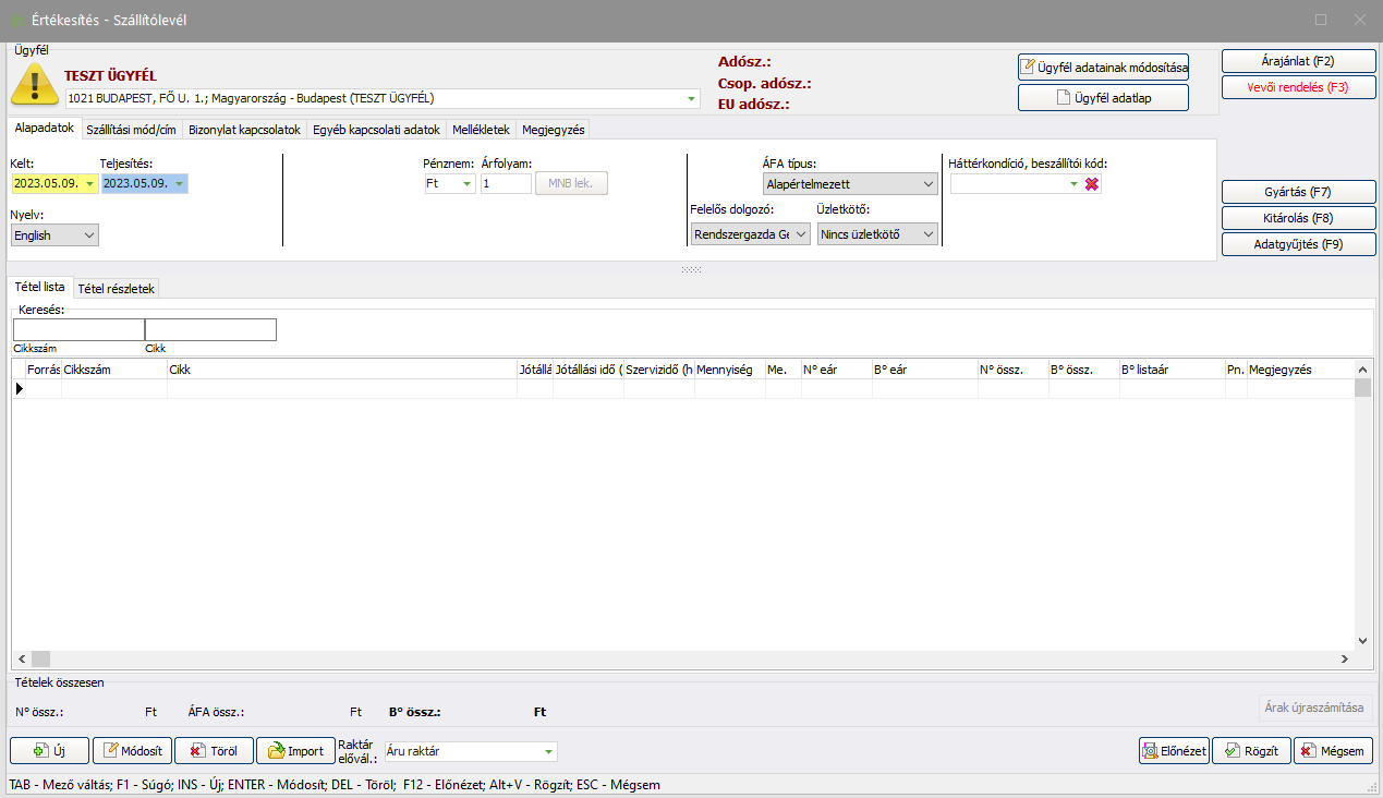- Ha megadott minden szükséges adatot a fenti fülek segítségével, következhet a tételek hozzáadása a bizonylathoz. Előfordulhat, hogy már szerepel(nek) tétel(ek) a tétel listában, noha még nem adott manuálisan hozzá új tételt, például, ha előzménybizonylatot használt fel.