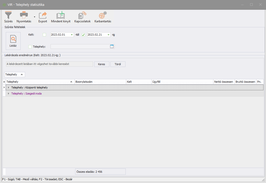 A lekérdezés telephelyenkénti bontásban mutatja meg az értékesítések darabszámát, illetve részletezve magukat az értékesítéseket is. Így arra használhatja, hogy kimutatást készítsen a telephelyek forgalmáról, illetve ez hogyan aránylik a teljes forgalomhoz és más telephelyek forgalmához.