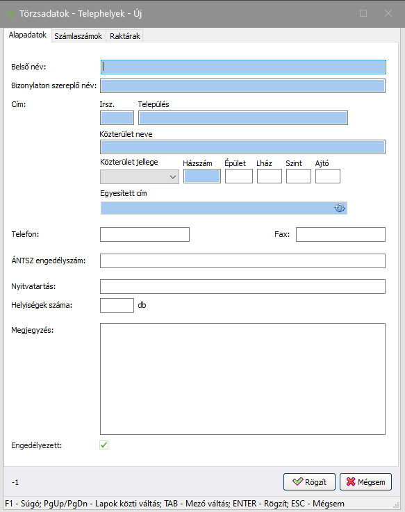 - Alapadatok fül - Ezen a fülön van lehetőség a telephely alapadatainak megadására. Az alapadatok többségében olyan adatokat tartalmaznak, amelyek használata mindennapos lehet, például nyitvatartási idő, telefonszám, saját megjegyzések, engedélyezettsége, stb.