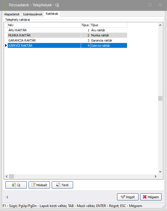 - Raktárak fül - Ezen a fülön van lehetőség rögzíteni további Egyéb típusú raktárakat az automatikusan létrejövő 4 rendszer raktár mellé!