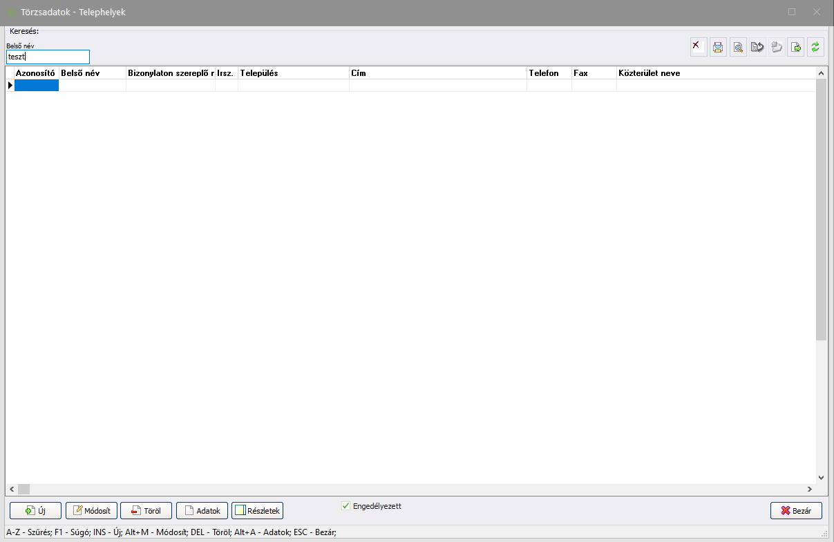 Fontos! Telephely végleges törlésére a rendszeren belül nincs lehetőség! A törlés funkció mindössze a telephely engedélyezett státuszát állítja át, ezáltal a beállított telephelyen nem lehetséges munka egészen addig, míg újra nem engedélyezik, viszont korábbi adatai és bizonylatai továbbra is elérhetők, rendszerezhetők maradnak.