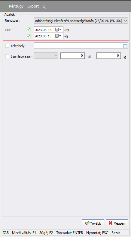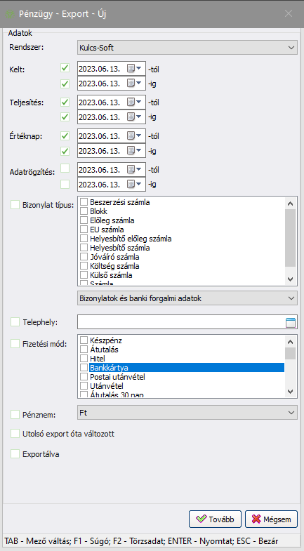 - Az export funkció az egyes adatádásokhoz megjegyzi, azok mely bizonylatokat tartalmaznak. Az exportálás paramétereihez elérhető egy új kapcsoló, mely segítségével megadható, hogy az exportált állományba a rendszer minden, a szűrési feltételnek megfelelő bizonylatot szerepeltessen, vagy csak azokat, amelyeket még korábban nem voltak exportálva.