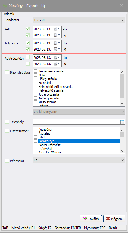 Fontos! TENSOFT típusú export esetében a rendszer mindig az ügyfél székhely adatait menti az export állományba.