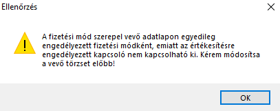 Figyelem! Fizetési mód addig nem állítható át nem engedélyezett státuszra, amíg a vevő törzs Egyedileg engedélyezett fizetési mód listájában szerepel, illetve Alapértelmezett fizetési módként megadásra került. Erről a rendszer figyelmeztetést jelenít meg.