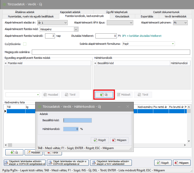 A Háttérkondícióknál lehetőség van adott vevőhöz tartozó Beszállítói kód és Háttérkondíció rögzítésére.
