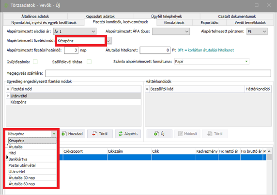 Bizonylat készítésekor az Egyedileg engedélyezett fizetési módok listában is szereplő, alapértelmezett fizetési módként rögzített fizetési mód töltődik be a bizonylatkészítő ablakba, azonban a lenyíló menüből lehetőség nyílik további, az Egyedileg engedélyezett fizetési módok listában szereplő, a vevőhöz rögzített egyéb engedélyezett fizetési módok kiválasztására is.