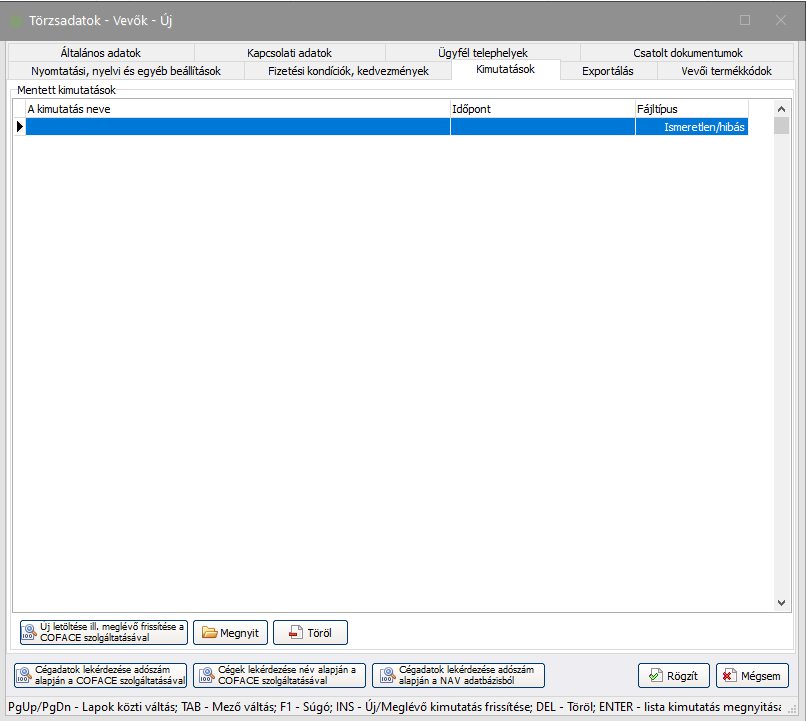- A Kimutatások fülön a COFACE szolgáltatással kapcsolatos kimutatások kérhetők és menthetők le.