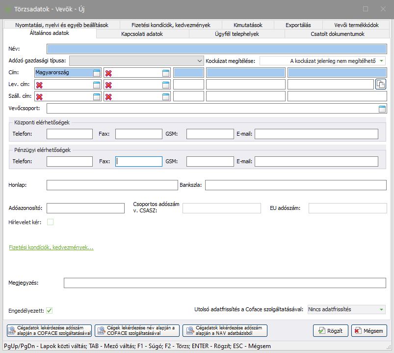A dátum mező értéke automatikusan kitöltődik az adott napra, amikor az adatlekérdezés történt a Coface szolgáltatással. A szolgáltatás használatához rendelkeznie kell előfizetéssel a COFACE-nál. (Bővebben a COFACE szolgáltatásról a Törzsadatok - Paraméterek - Törzsadatok c. részben.) |