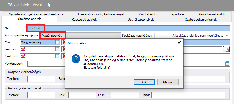 Mielőtt rögzíti az új vevőt, a rendszer a név és gazdasági típus kapcsoló vonatkozásában ellenőrzést végez, miszerint ha a név alapján valószínűsíthetően jogi személyt szeretne rögzíteni, akkor a rendszer figyelmeztet.