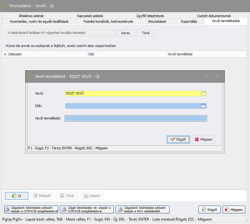 Új vevői termékkód rögzítése adott Vevőhöz: