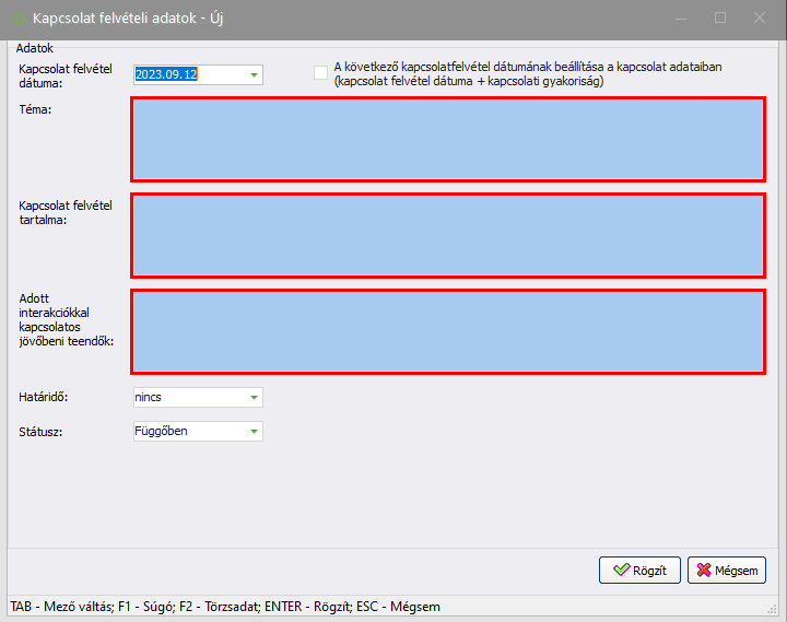: Az adott interakciókkal kapcsolatos jövőbeni teendőkhöz kapcsolódó határidő. Amennyiben a jelenlegi kapcsolati személy adatainál be van állítva Felelős, úgy a Felelős e-mailcímének megadottságától függően a rendszer a határidő előtt 3 nappal üzenetet küld a Felelősnek vagy az alapértelmezett e-mailcímre. Kétféle érték állítható be: egy konkrét dátum vagy „nincs”, ebben az esetben a rendszer nem küld üzenetet a határidő közeledése miatt.