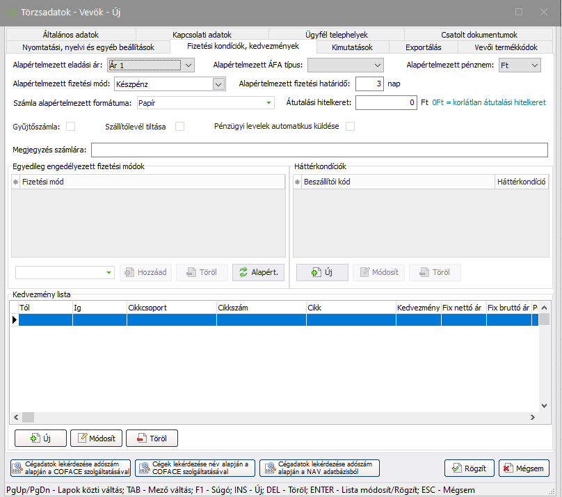 - A Fizetési kondíciók, kedvezmények fülön opcionálisan beállíthat a vevő számára cikkcsoport(ok)ra és/vagy cikk(ek)re érvényes kedvezményeket, árakat, fizetési módot, háttérkondíciókat.