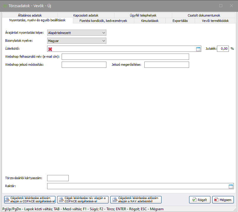 Új vevő létrehozásakor a megjelenő ablakban az alábbi fülekkel találkozhat: (ezeket alább részletesen bemutatjuk):