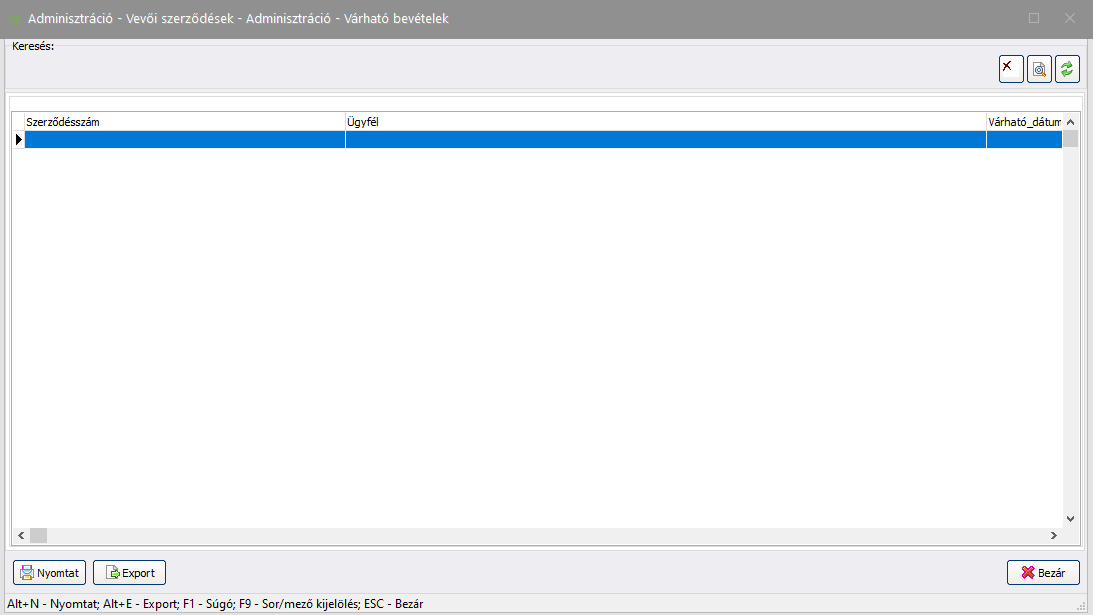 Ez a menüpont egy vevői szerződésekre épülő listát ad eredményként. A dátumválasztóban megadott intervallumon belül várható számlázások listáját kapjuk: