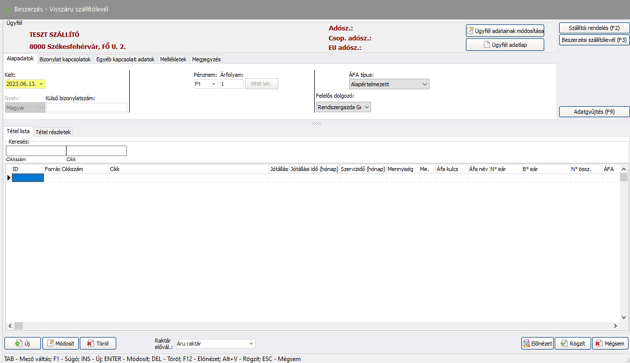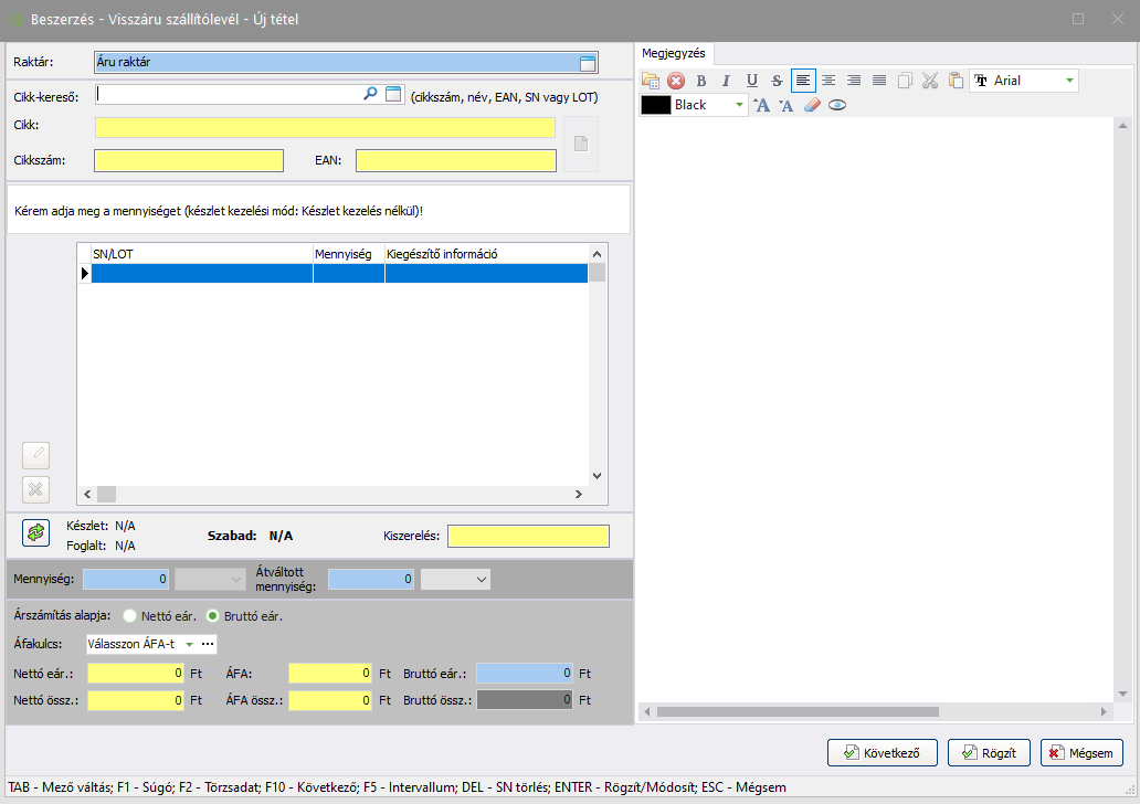 (Következő) gomb segítségével, vagy az F10 gyorsbillentyű használatával van lehetőség. - Visszáru szállítólevél bizonylat rögzítéséhez kattintson a