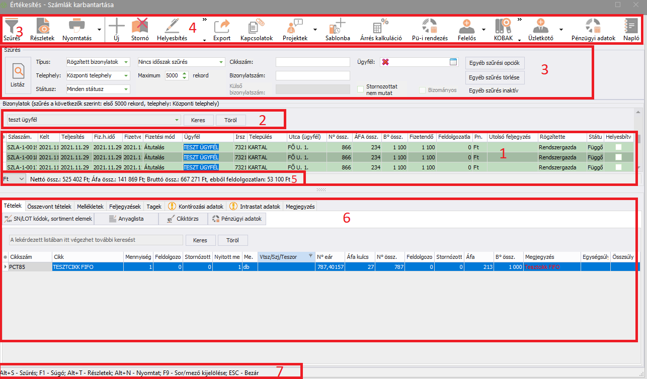 - Bizonylatok szűrt listája: Ebben a keretben jelennek meg azok a bizonylatok, amelyek megfelelnek az ablakon belül beállított szűrési feltételeknek. A lista elemei színekkel megjelölve jelennek meg, melyet a program beállításaiban egyedileg módosíthat. Amennyiben ebben a keretben egy elemre kattint, úgy a 6-os résznél levő részleteknél több információt olvashat el az adott bizonylatról.