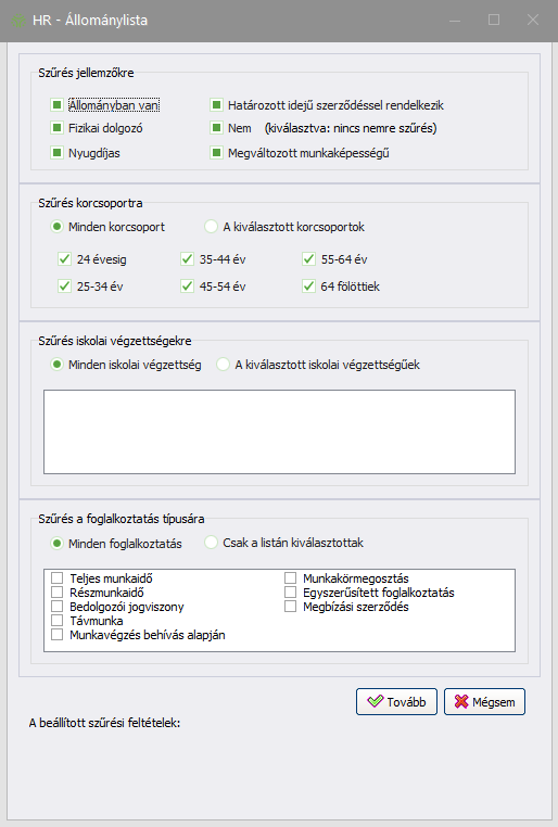A rádiógombok segítségével megadhatja, hogy az összes iskolai végzettségű dolgozót listázni kívánja vagy csak a kapcsolókkal kiválasztott iskolai végzettségűeket. Fontos! A program a HR modulban rögzített iskolai végzettségekkel tölti fel a választómezőt! |
