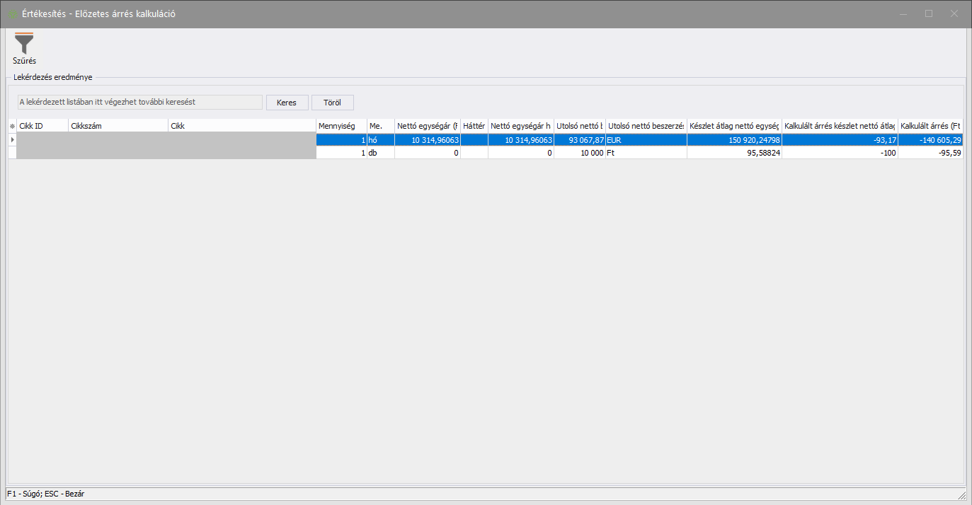 - Az (Előzetes árrés) gomb megnyomására (jogosultság függvényében) megtekinthetőek a cikkek várható árrésszámításai - ezek az adatok muinden esetben TÁJÉKOZTATÓ JELLEGŰEK. A lekérdezés oszlopai: