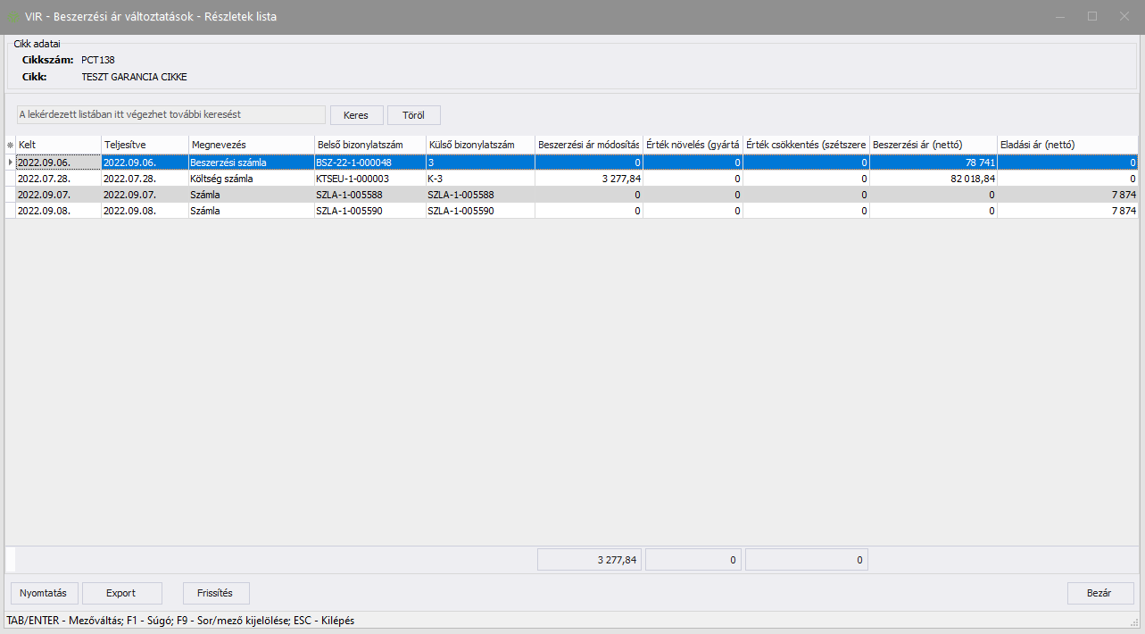 A lista egyik során dupla egérkattintással megjeleníthető egy részletező ablak. Itt megtekinthetők azok a bizonylatok, melyekből összetevődik a beszerzési ár változtatások folyamata. A listában megjelennek a bizonylatok adatai, a beszerzési ár változások összegei, valamint az aktuális beszerzési árak. Amennyiben a cikk ideiglenes bizonylaton szerepel, úgy azt az ablak jobb felső sarkában olvashatjuk.Az ablakban megjelenített lista exportálható, nyomtatható.