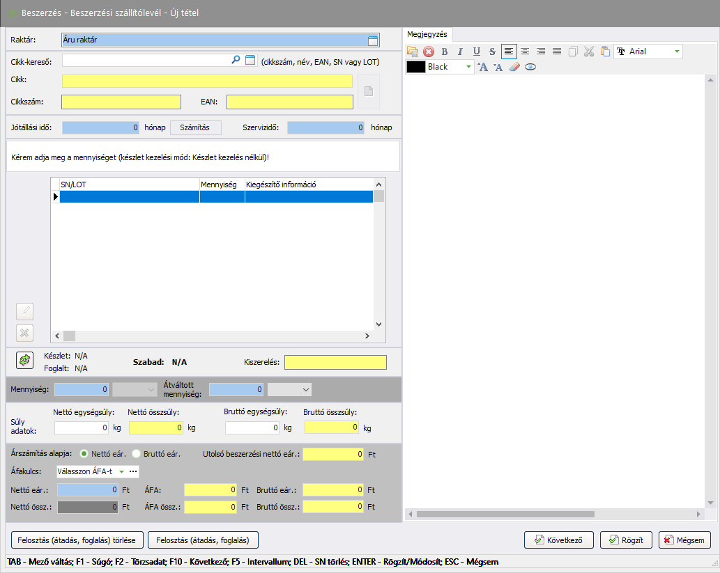 17. Amennyiben LOT kódos, vagy egyedi SN kódos termék beszerzését rögzíti, úgy a program a Mennyiség: mezőt sárga háttérszínnel jelöli, és módosítása kézzel nem lehetséges. Ebben az esetben ugorjon a következő (17.) pontra, és folytassa onnan a műveletsort! Ha nem SN, vagy LOT kódos terméket rögzít, ezáltal a Mennyiség:
