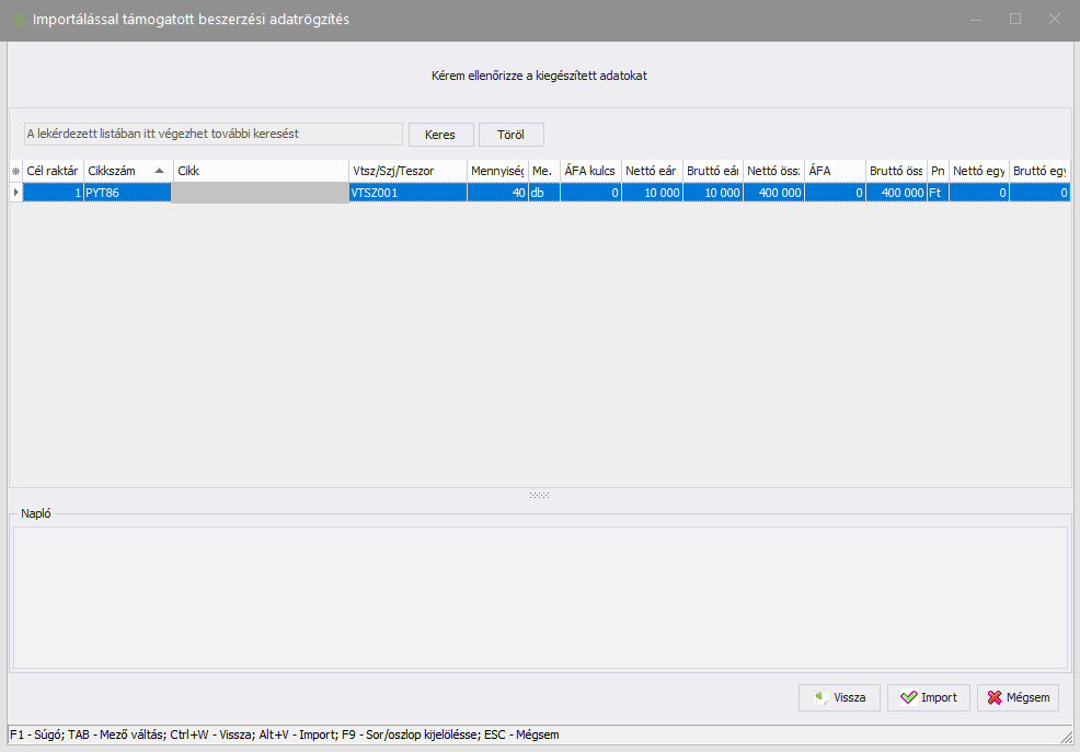 (Bezár) gombra kattintva visszajutunk a beszerzési bizonylat ablakba, a bizonylaton megjelennek az importált tételek, és a bizonylatrögzítés a megszokott módon folytatódhat.