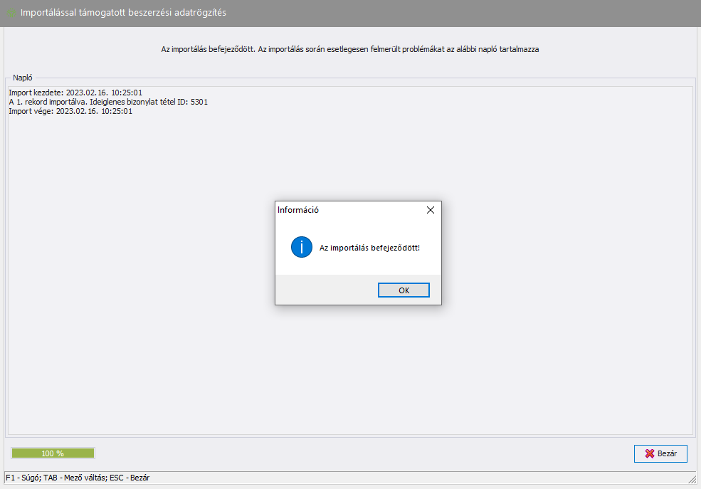 (Import) gombra kattintva elindul az importálás, ahol a folyamat végeztét egy felugró információs ablak jelzi, valamint a háttérben megtekinthető a napló: