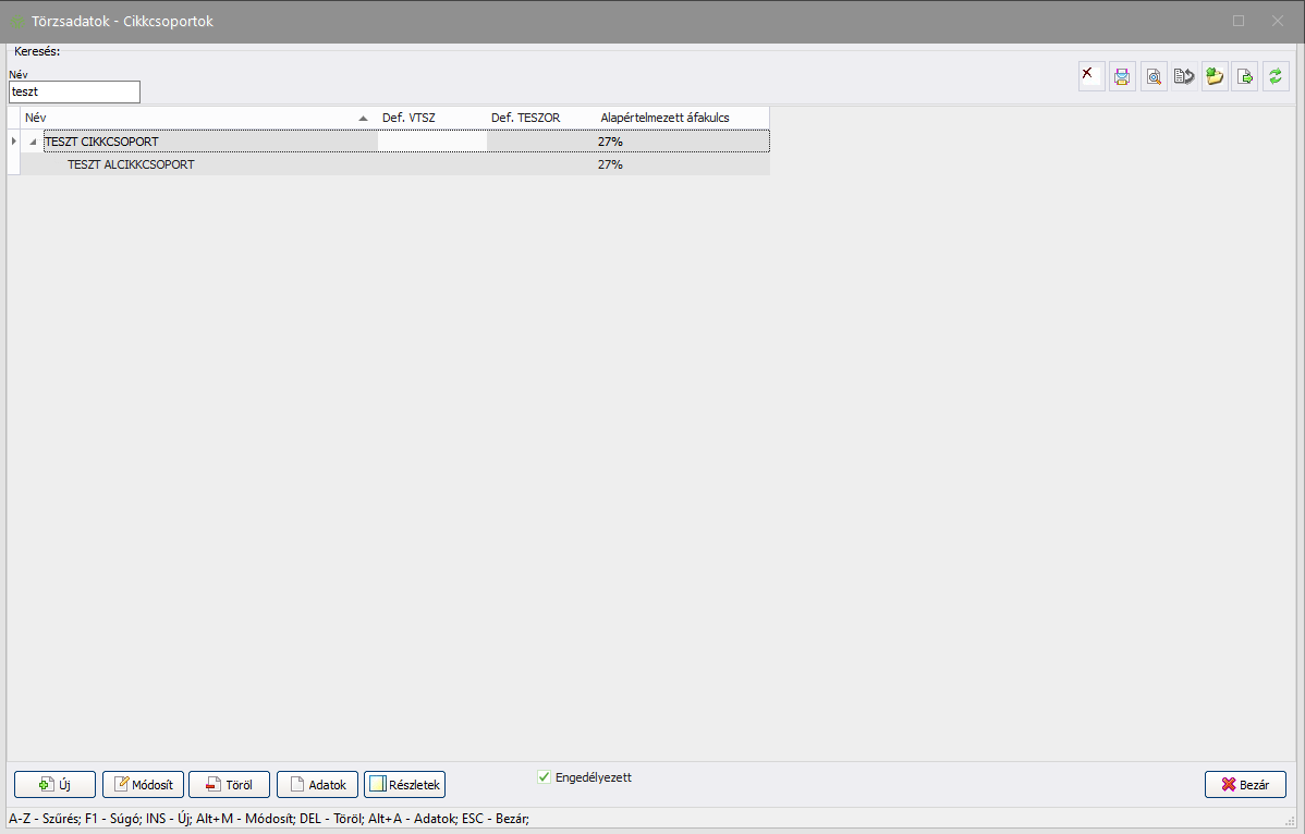 Engedélyezett: Csak olyan cikkcsoportok listázása, amelyeknél be van állítva az Engedélyezett opció.