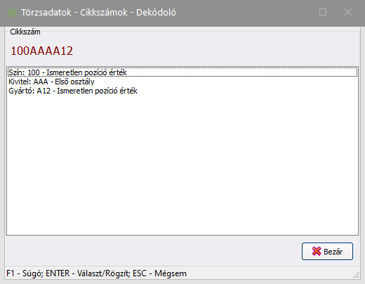 Fontos! Minden cikk cikkszámára alkalmazható a cikkszám dekódoló funkció, azokra a cikkekre is, amelyek nem a cikkszám kódolóval készültek! Ilyen esetben dekódoló használata esetén nagy valószínűséggel a visszakapott értékek „Ismeretlen pozíció érték”-kel bírnak, vagy ha lesz értékük, fals értéket képviselnek.