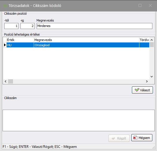 A Törzsadatok -> Cikkszámok ablak bal oldali részén válasszon ki egy cikkszám pozíció megnevezését.