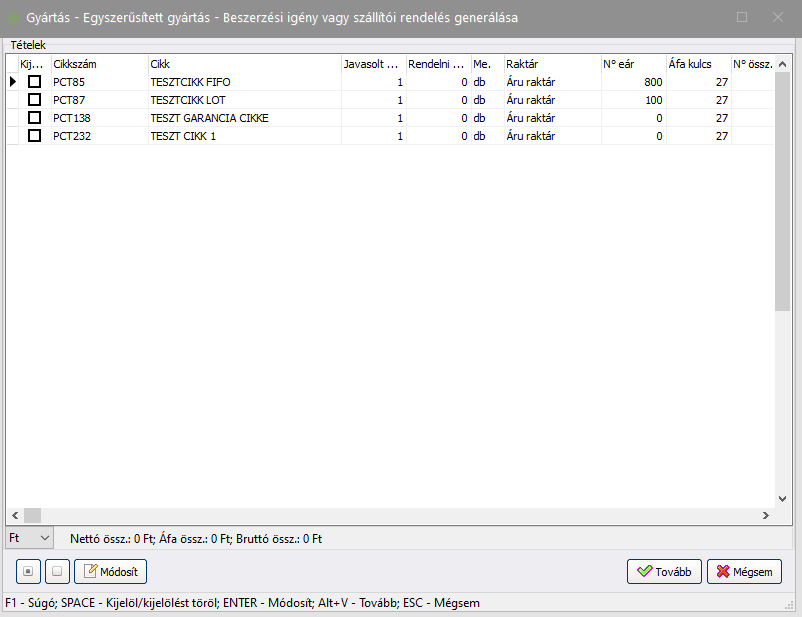 - A Gyártás->Egyszerűsített gyártás ablakban VAGY