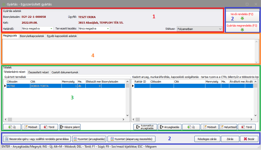 Az egyszerűsített gyártás munkalap nagyon hasonló a gyártás munkalaphoz, kiegészítve néhány funkcióval. Itt adminisztrálhatja a legyártandó termékeket, a szükséges anyagokat, az anyagkiadást és az esetleges visszavételezést, a legyártott termékek készrejelentését, hiányzó anyagok beszerzését és a gyártás zárását. A munka adatlap felépítését a következő ábrán láthatja: