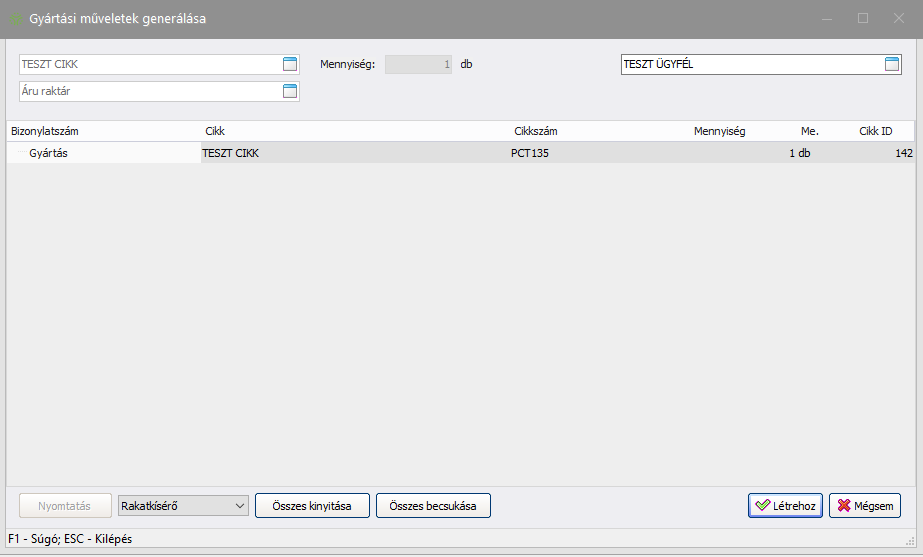 Amennyiben megfelelőek a létrejövő bizonylatok, úgy a Létrehoz (Létrehoz) gombbal rögzíthetjük őket a rendszerben. A listában az alapanyagok nem láthatók, kivéve, ha maguk is gyártmányok. Amennyiben egy olyan cikkből, mely szükséges a fő gyártáshoz, van készleten az adott raktárban, akkor anyagkiadás történik, és nem indul gyártás az adott cikkre.