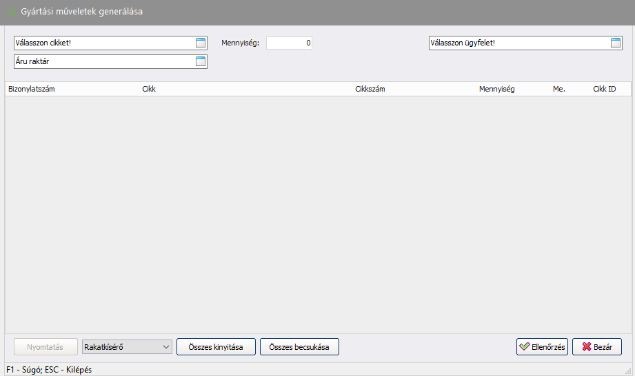 - (Nyomtatás): A kijelölt gyártáshoz Rakatkísérő vagy Gyártásindító nyomtatása.