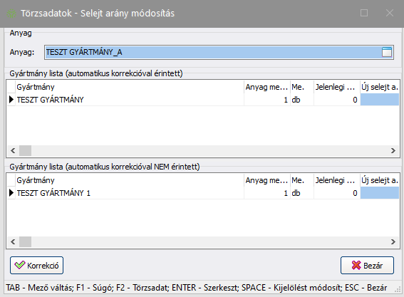 A listákban látható a gyártmány adatlapon jelenleg megadott selejt arány és az anyag adatlapon megadott új selejt arány. A korrekció a jelölt gyártmányok tekintetében megy végbe, a régi selejt arány felülíródik a megadott újra, melynek alapértelmezése az anyag adatlapján megadott arány. Ettől természetesen eltérhet a megadott soron (Új selejt arány oszlopban) duplán kattintva vagy ENTER billentyűt ütve. Mindkét listában lehetséges a korrekció beállítása a sor végén látható jelölők segítségével. A művelet a (Korrekció) gomb segítségével indítható. A korrekció lefutása előtt a program egy új ablakban megerősítést kér.